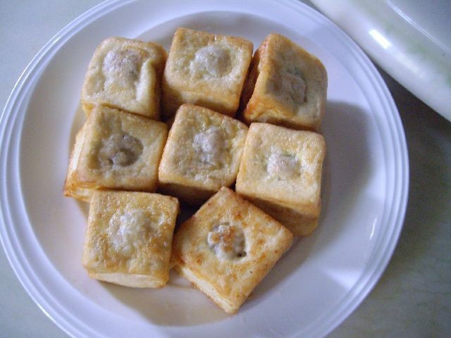 所以我就挖了鑲豆腐的孔,然後填絞肉、蝦泥